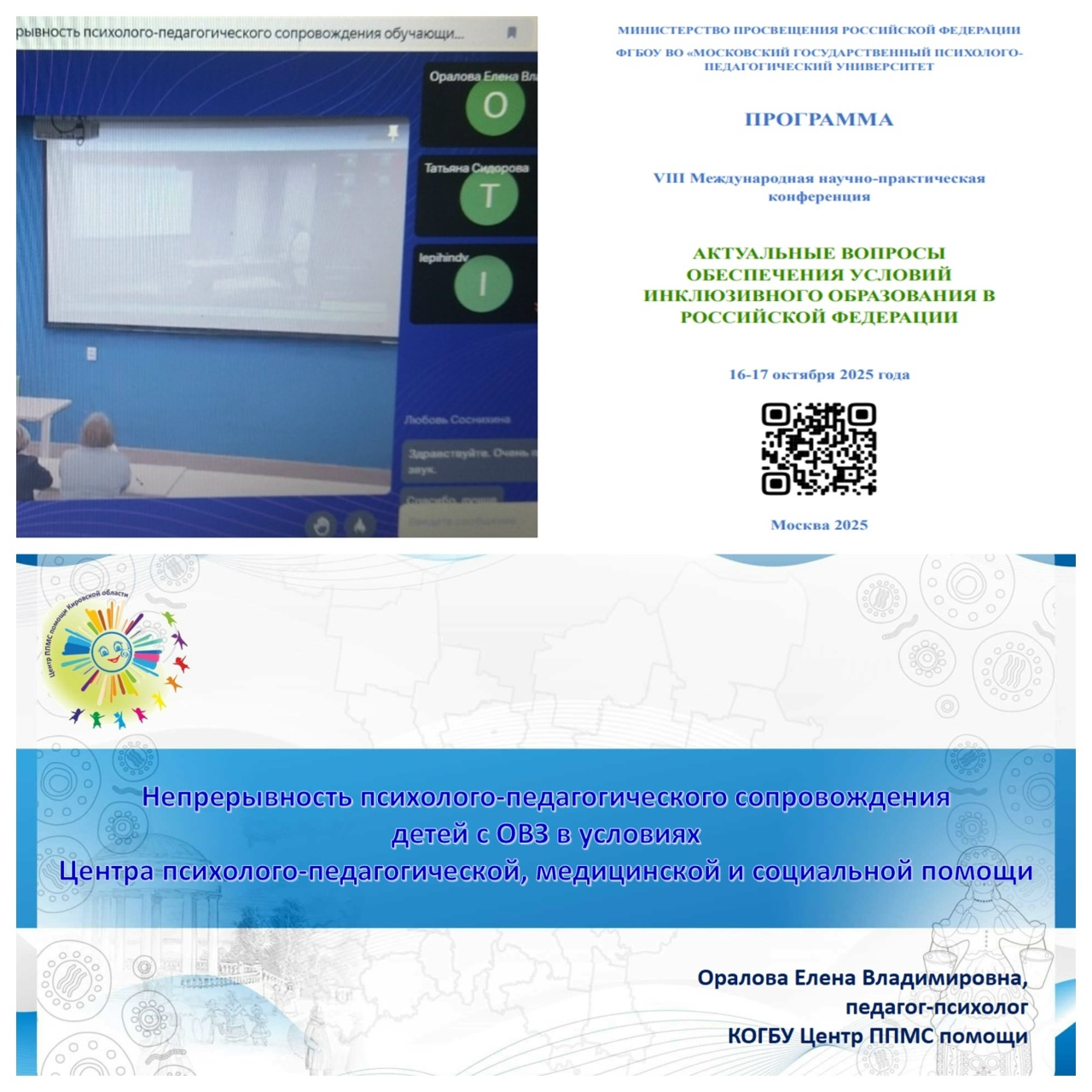 16 октября педагог-психолог КОГБУ Центр ППМС помощи Оралова Е.В. приняла участие в VIII Международной научно-практической конференции «Актуальные вопросы обеспечения условий инклюзивного образования в Российской Федерации» в онлайн-формате. Она представила доклад на тему «Непрерывность психолого-педагогического сопровождения детей с ОВЗ в условиях Центра психолого-педагогической, медицинской и социальной помощи».